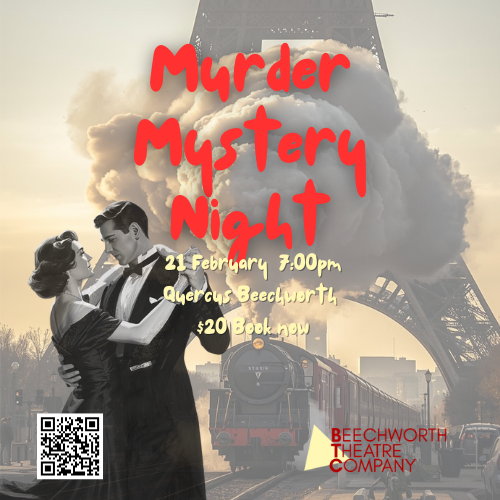 We will supply some yummy desserts, tea and coffee, and a free glass of bubbles on entry! Our Murder Mystery is ‘Last Train from Paris’ so feel free to dress up in some 1940’s glam gear to make your night even more fun! We’ll also be giving away double passes to our major production of 2026 ‘The Importance of Being Earnest’ – on in May!